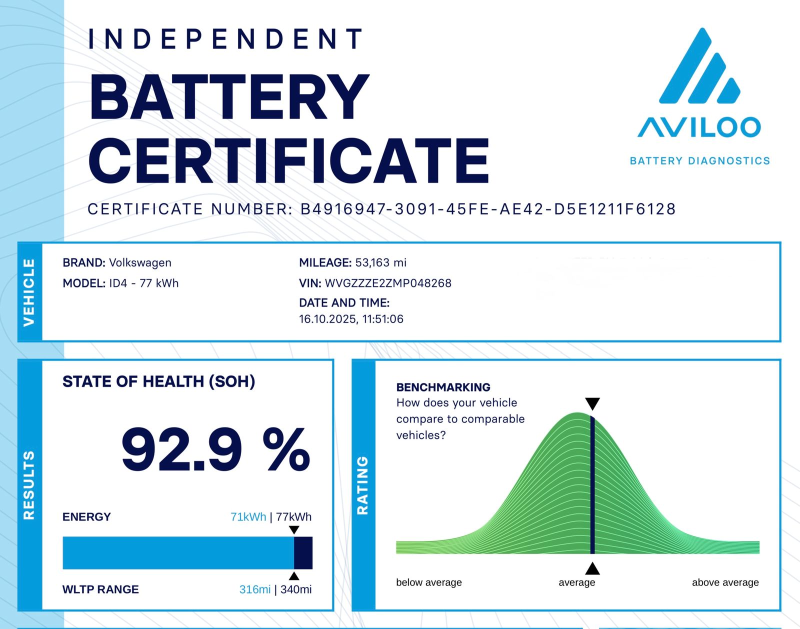 This 2021 Volkswagen ID.4 Pro Performance 1ST Edition is a superb example in outstanding condition, having had just one owner from new. As a fully electric vehicle, it offers a smooth and quiet driving experience, powered by an 82 kWh battery that provides a maximum range of 310 miles when new. A recent battery health check indicates that this efficient EV retains a very respectable 92.9 % of its original capacity, with the reassurance of the manufacturers high voltage battery warranty remaining until July 2029. An impressive electric SUV it boasts a generous boot space, perfect for all your needs. Inside, you'll find a heated multifunction leather steering wheel and heated front seats for added comfort, while LED headlights with automatic switching ensure optimal visibility. The Air Care Climatronic 2 zone air conditioning system keeps the cabin at the perfect temperature, and keyless entry and start offers ultimate convenience.